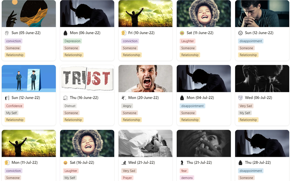 See your mood and topic at a glance—without opening the full entry.